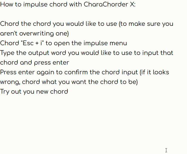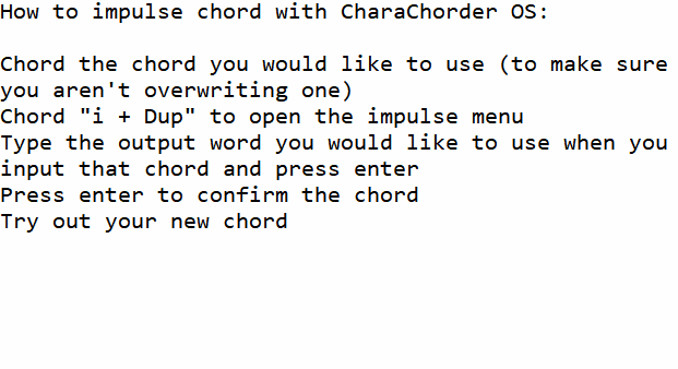 Akordowanie impulsowe to metoda dodawania akordów, która nie wymaga niczego poza Twoim urządzeniem CharaChorder i miejscem do pisania. Umożliwia tworzenie niestandardowych akordów „w locie”, które można spontanicznie definiować wszędzie tam, gdzie możesz pisać, za pomocą menu Impulse.