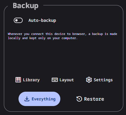 Przywracanie nie kasuje danych z urządzenia. W przypadku konfliktów (np. zmiana ustawienia, inny klawisz w układzie czy inny output akordu), dane zostaną nadpisane. Ustawienia i układ zawsze nadpisują całość.