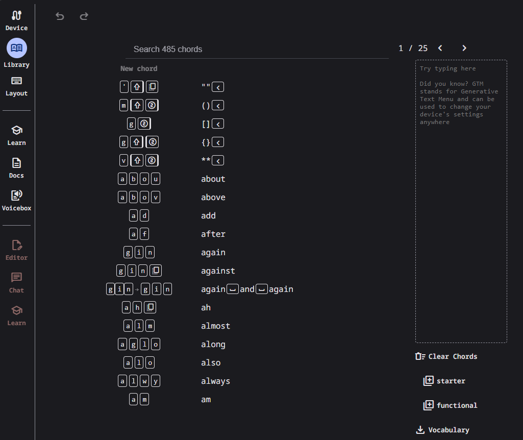 Menedżer Urządzeń CharaChorder to kompleksowe narzędzie dla użytkowników urządzeń z systemem CCOS. Oferuje wysokiej jakości grafikę, animacje i prosty interfejs użytkownika. W Menedżerze Urządzeń możesz zmieniać układ, zarządzać swoją biblioteką akordów, oraz dostosowywać ustawienia swojego urządzenia.