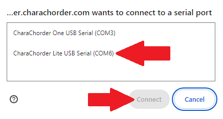 Gdy pojawi się okno z napisem „charachorder.io wants to connect to a serial port”, wybierz swoje urządzenie CharaChorder, a następnie kliknij przycisk „Connect”.