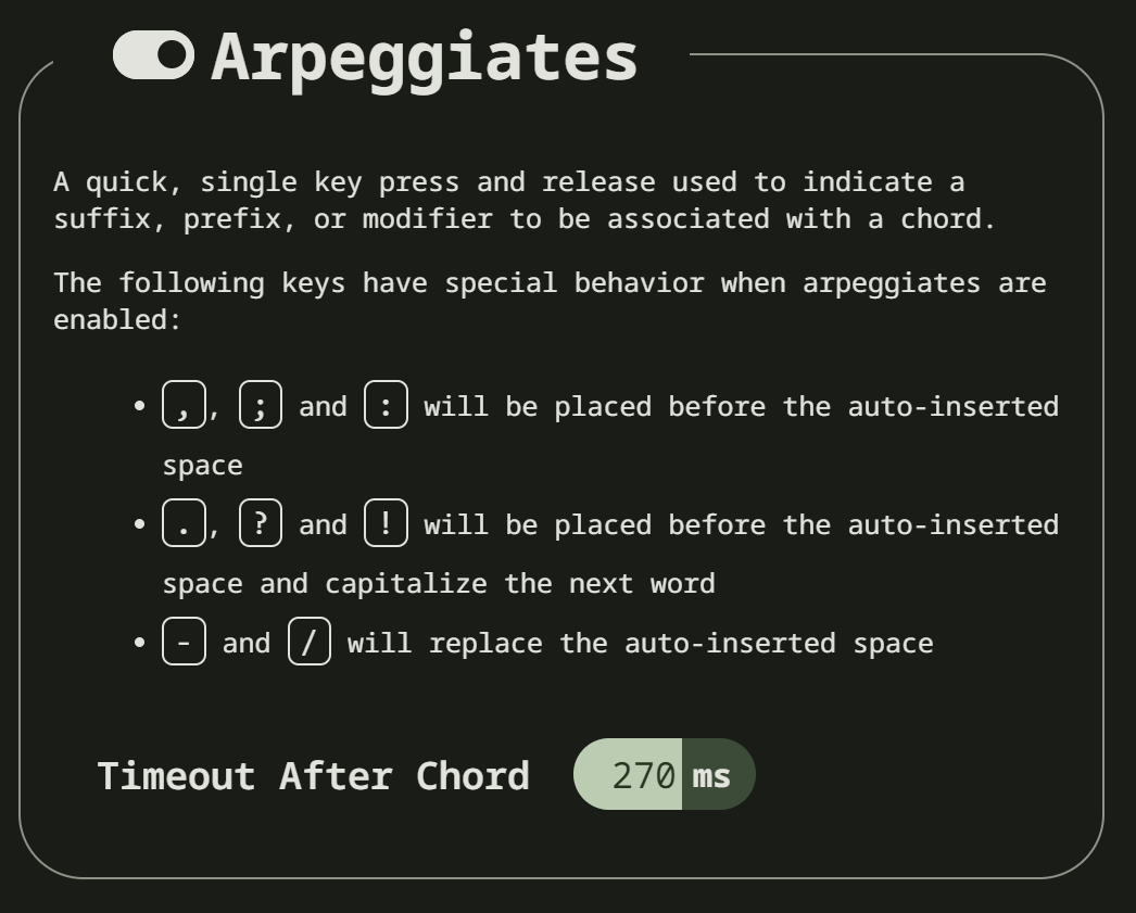 Przykładowo: po zaakordowaniu słowa run, możesz w czasie trwania limitu czasu arpeggiacji wcisnąć modyfikator czasu przeszłego, aby zamienić je na ran.