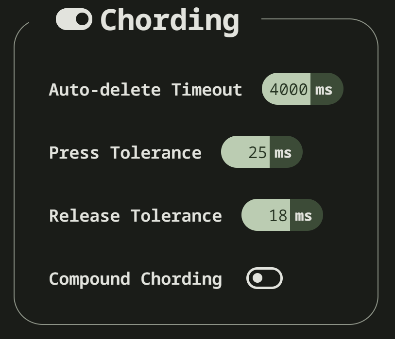 Tolerancja zwolnienia określa okno czasowe, w którym może zostać wykonany akord, mierzone w milisekundach (ms). Licznik ten uruchamia się przy pierwszym zwolnieniu dowolnego klawisza w akordzie i kończy po pełnym wykonaniu akordu lub po upływie limitu czasu — w zależności co nastąpi wcześniej. Dokładniejsze wyjaśnienie znajdziesz w sekcji GTM.