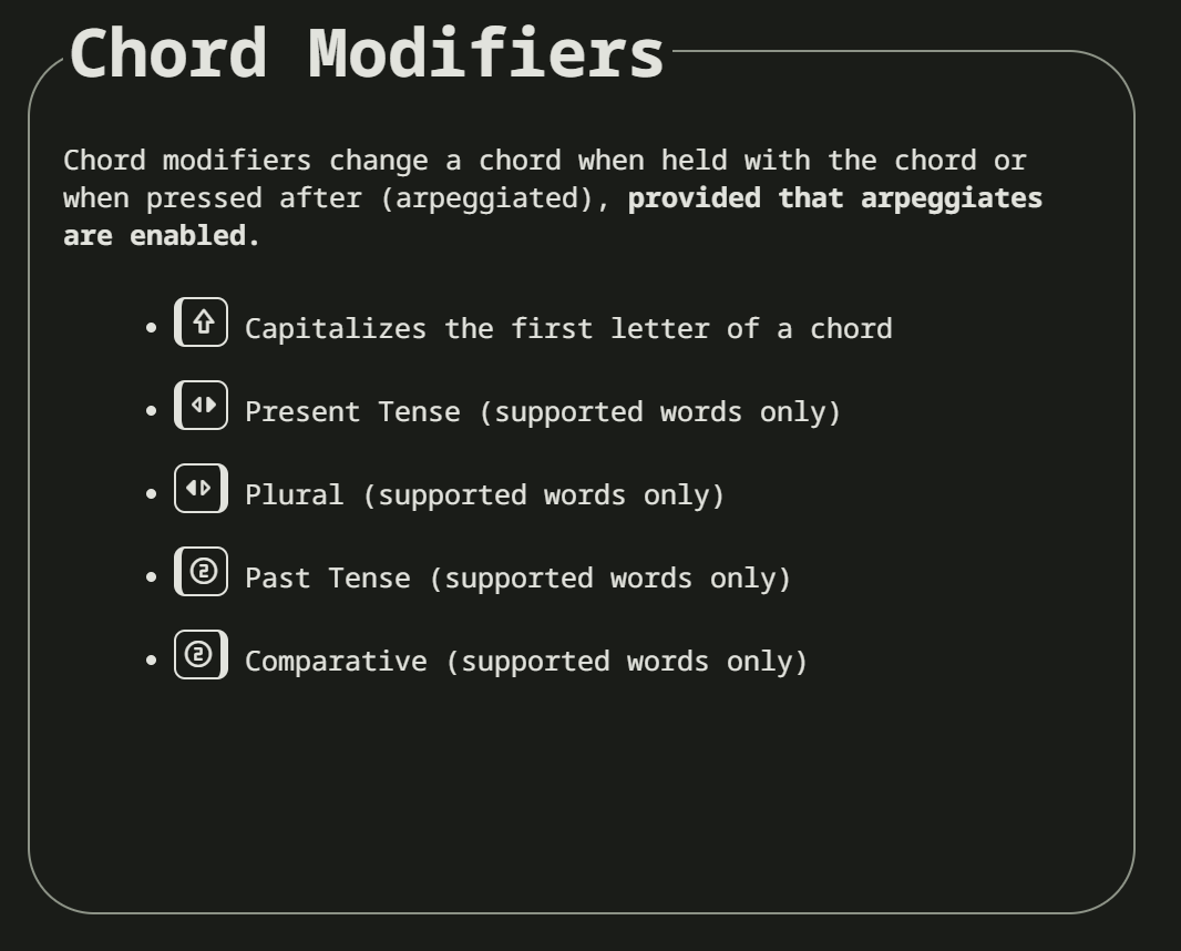 Na luty 2024 obsługa modyfikatorów akordów dostępna jest wyłącznie na urządzeniach CharaChorder One i CharaChorder Lite oraz tylko w języku angielskim.